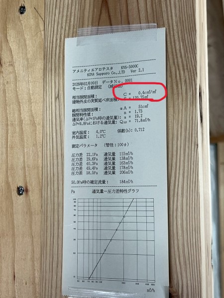 ※C値とは、住宅にどれくらいの隙間があるかを示した数値で、家の気密性能を客観的に評価するための指標(相当隙間面積)です。 具体的には、家全体にある隙間の合計面積(㎠)を、建物の延床面積(㎡)で割って算出します。 このC値の数字が小さいほど、隙間が少なく気密性能が高い住宅であることを意味します。)